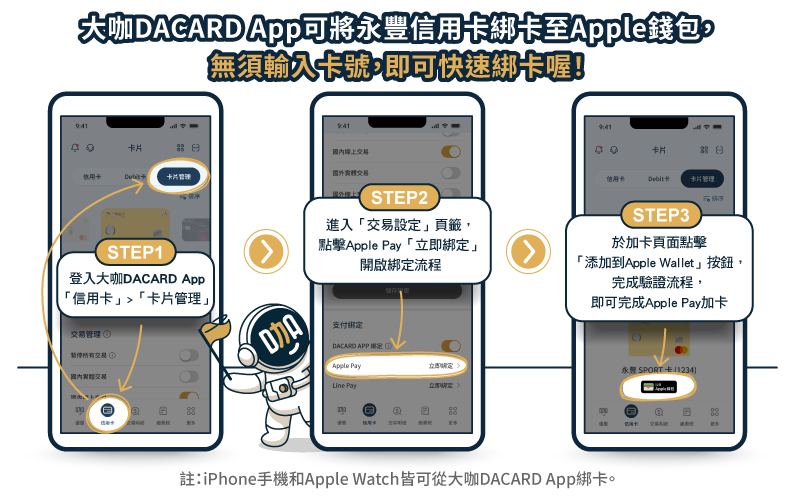- iPhone手機和Apple Watch皆可從大咖DACARD App綁卡。