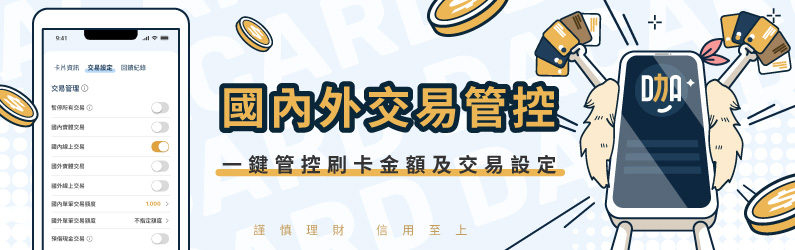 無論是國內外線上或實體交易,皆可進行開關設定;亦可進行單筆交易額度設定;暫時不用該張卡片,亦可選擇暫停所有交易。