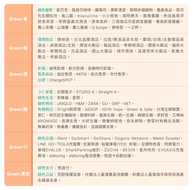 - 「精選國內綠色通路加碼回饋4%」精選國內綠色通路明細如下: