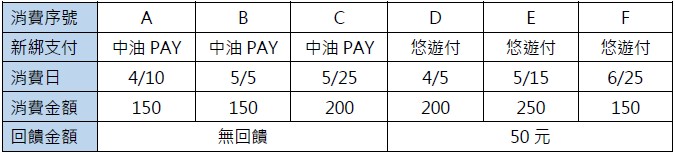 - 第D、E、F筆符合新綁定特選支付(悠遊付),且分別於4月、5月、6月使用同一支付連續消費3個月,($200+$250+$150) x10%=60元,依每卡戶(正附卡合併計算)每種特選支付回饋上限50元,故獲得50元回饋刷卡金。
