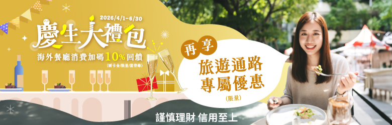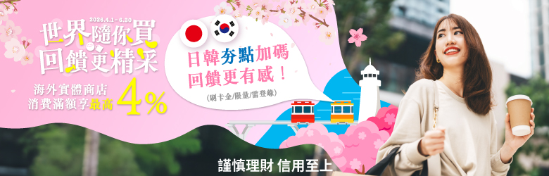 - 活動期間每戶(正附卡合併計算)限擇優回饋乙次,單月最高回饋10,000元。正附卡合併計算消費金額與回饋資格,惟回饋對象為有效之正卡持卡人。贈送之刷卡金將於活動結束後次次月起陸續回饋(舉例說明:2026年4-6月每月的消費,統一於2026年8月開始回饋)。本活動贈送之「刷卡金」僅限折抵信用卡消費款,恕不得要求轉讓、提領或兌現。