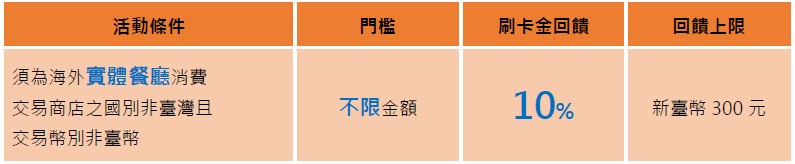 ※本回饋活動係針對海外實體餐廳消費換算新臺幣後,依其收單機構設定之商店類別代碼商家類別代碼(Merchant Category Code)之餐廳分類代號MCC code為5811、5812、5813、5814者。