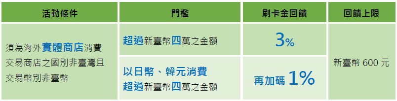※本回饋活動係針對海外實體商店消費滿額換算新臺幣後,就超過新臺幣四萬元之部分進行回饋,非整筆累積消費金額回饋。