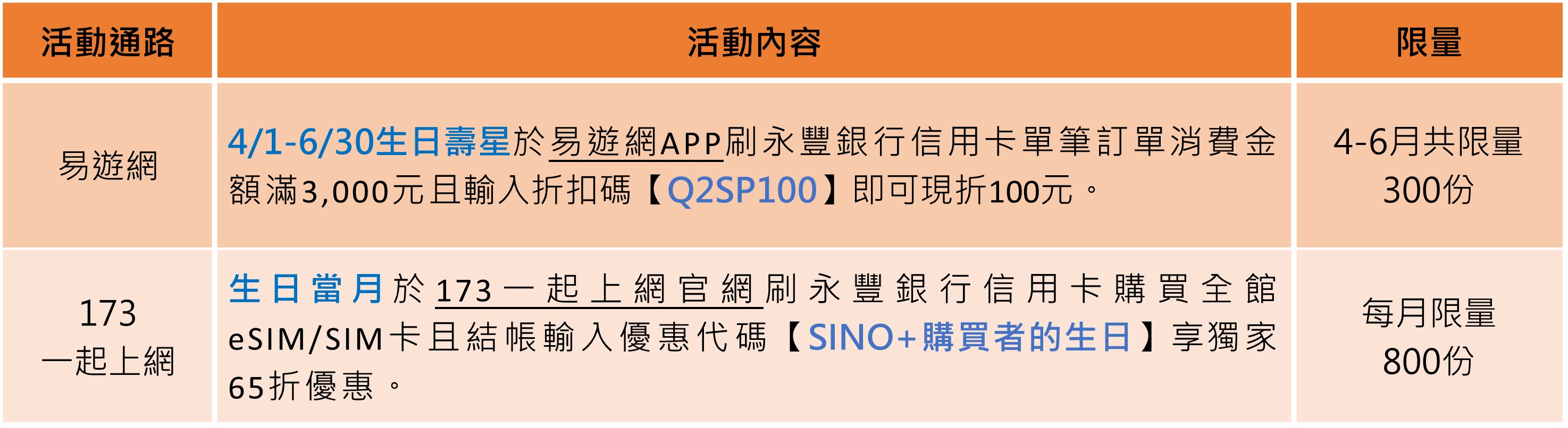 *本優惠須透過永豐信用卡專屬「173一起上網」網頁訂購,且須使用永豐信用卡刷卡完成線上訂購始得享有優惠。