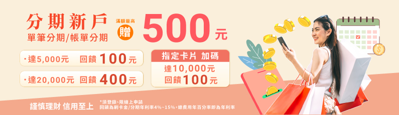 - 活動內容:符合分期新戶資格之客戶線上申辦單筆消費分期或帳單分期並登錄,每戶擇優回饋乙次,上限500元刷卡金(單筆滿額回饋400元+指定卡片加碼100元)