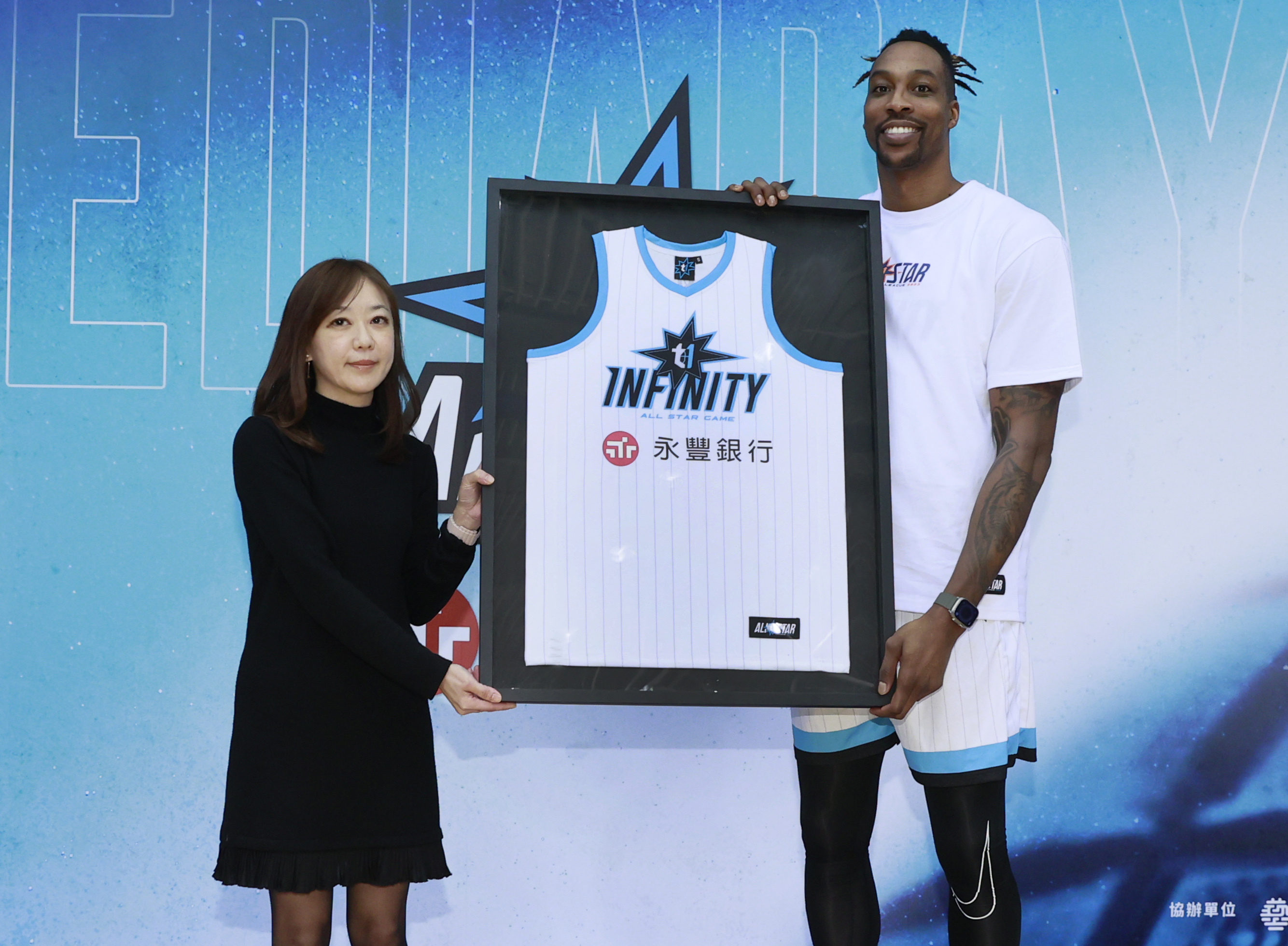圖說:永豐銀行支持國內體育多元發展,今(20)日宣布冠名贊助由T1聯盟主辦的「永豐銀行T1聯盟明星賽」,也是台灣籃壇近20年首場職業籃球明星賽。圖為永豐銀行數位金融處處長黃品睿(左)代表接受桃園永豐雲豹籃球隊隊員「魔獸」霍華德致贈明星賽冠名球衣。
