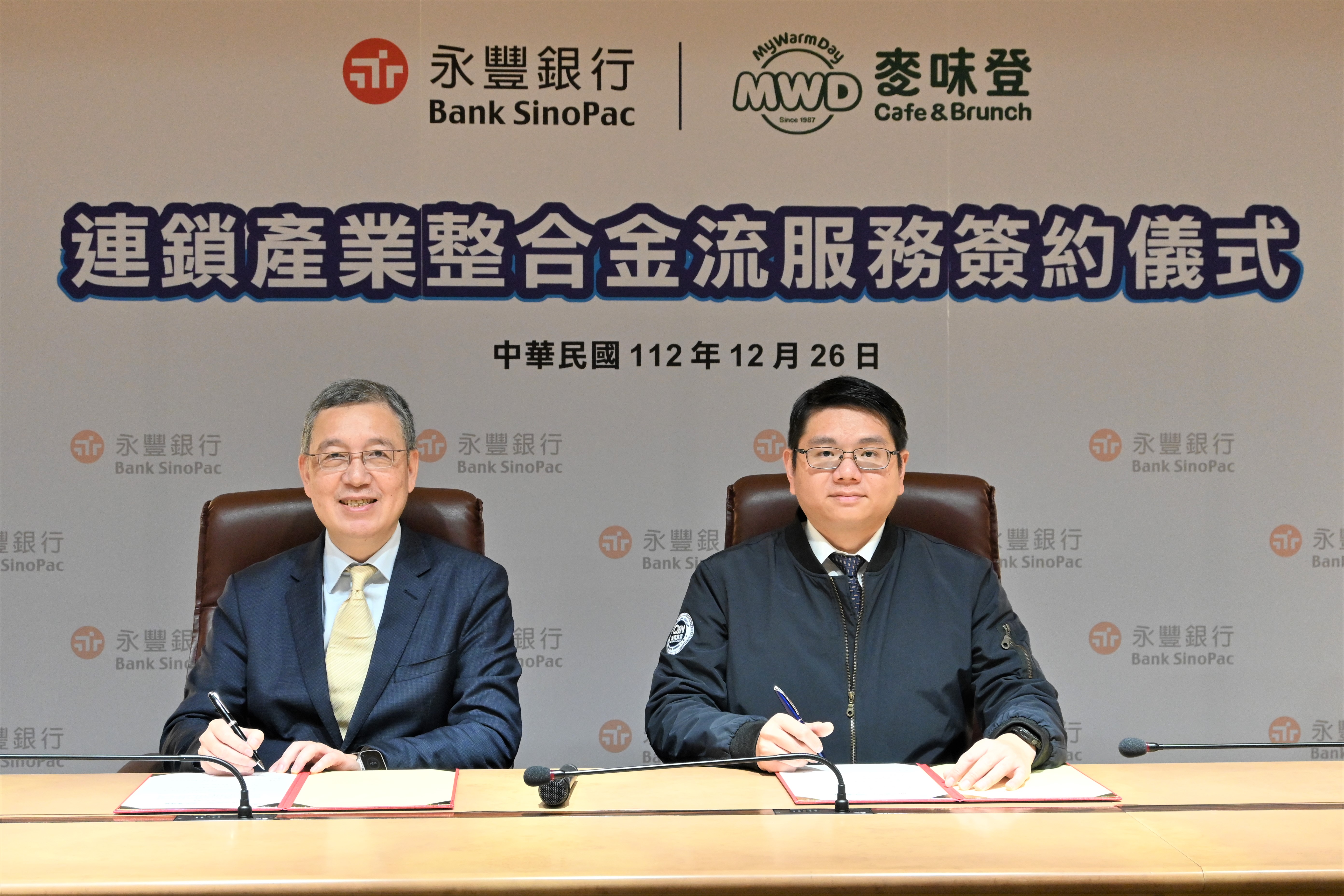 圖說:永豐銀行與麥味登今(26)日啟動企業數位化金流全新服務,協助麥味登全台門市透過eACH線上即時代收貨款或對帳等作業,並簡化加盟主開店所需各項金流服務申請流程。左為永豐銀行總經理莊銘福,右為揚秦國際董事長卓靖倫。