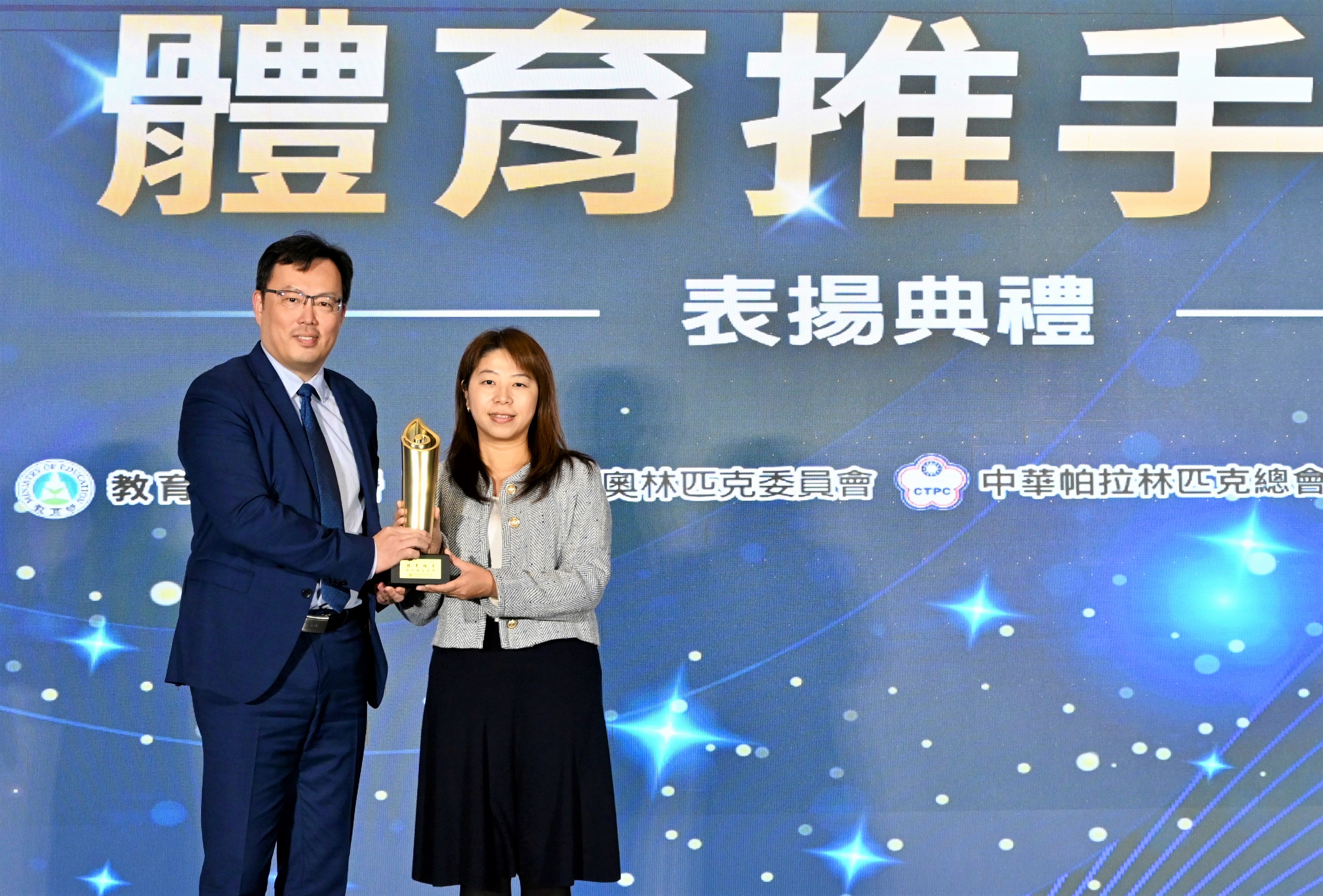 圖說:永豐銀行榮獲教育部體育署「113年體育推手獎一贊助類金質獎」,由體育署署長鄭世忠(左)頒獎,永豐銀行副總經理王筱嵐(右)代表領獎。