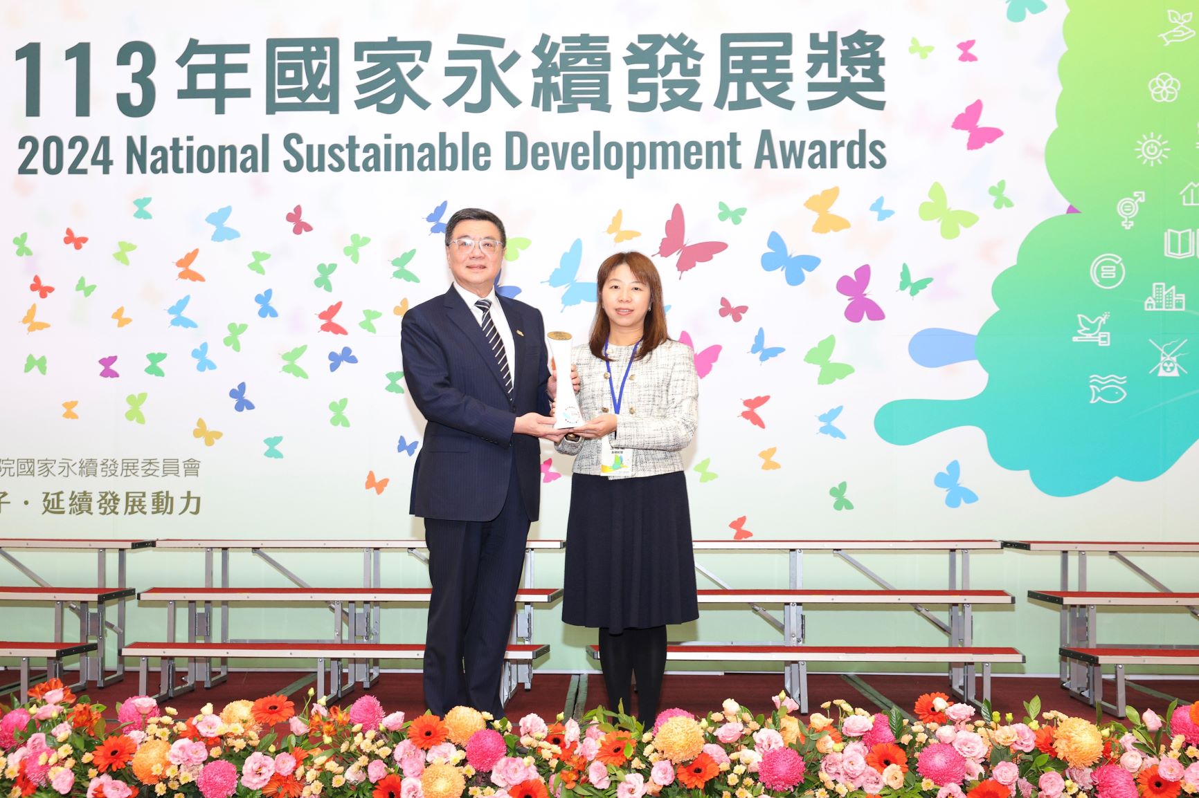 圖說:永豐銀行首獲行政院國家永續發展委員會頒發「113年國家永續發展獎」,亦為今(2024)年唯一獲獎的民營銀行,肯定永豐於ESG(環境、社會、治理)的全方位表現。由行政院長卓榮泰(左)擔任頒獎人,永豐銀行副總經理王筱嵐(右)代表領獎。