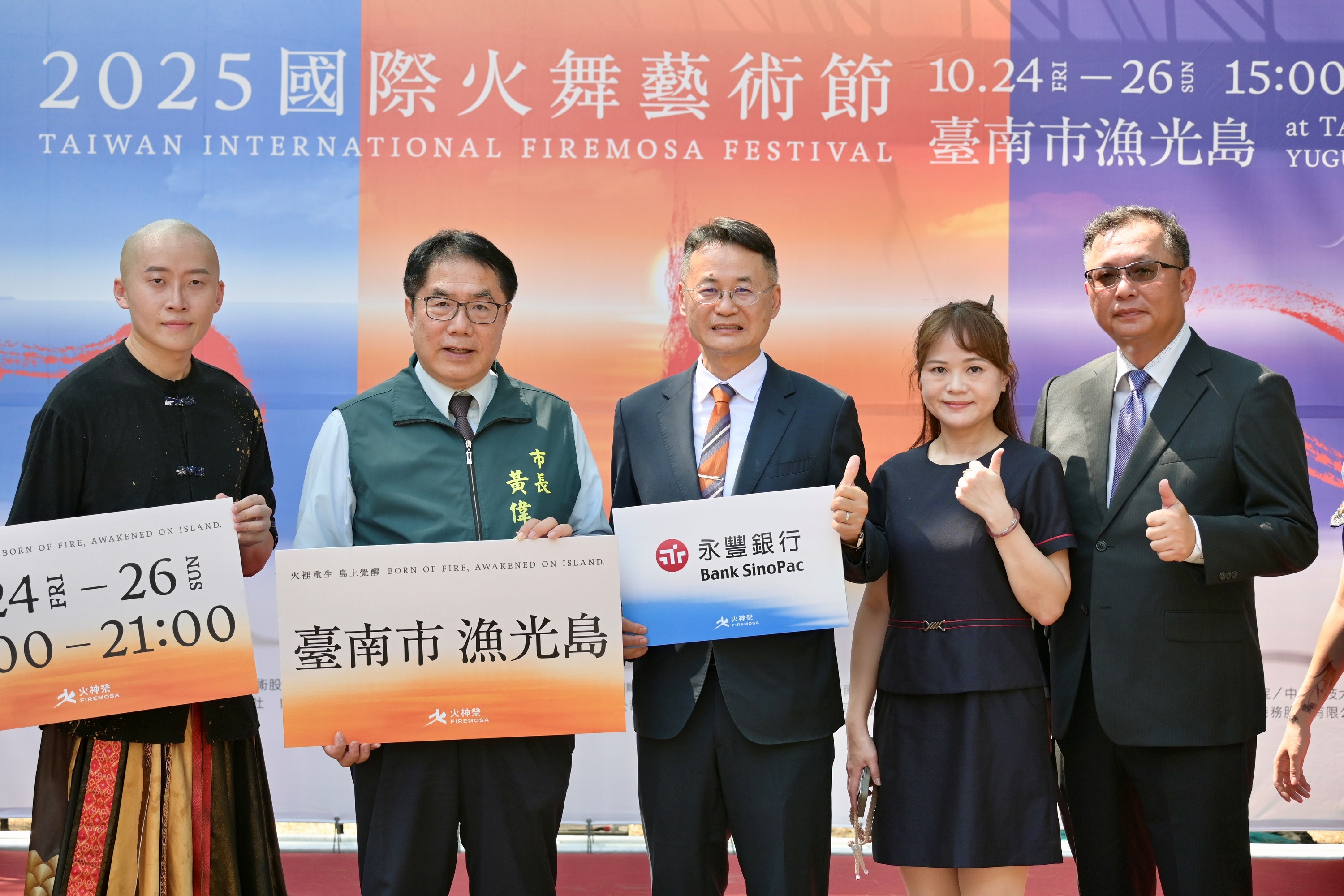 圖說:永豐銀行贊助「 2025國際火舞藝術節」,10月24至26日將於臺南漁光島登場;今(13)日由主辦單位即將成真火舞團團長蔡宏毅(左一)、臺南市長黃偉哲(左二)、永豐銀行副總經理蕭益昇(左三)共同出席記者會,力挺在地文創、促進國際藝術交流。
