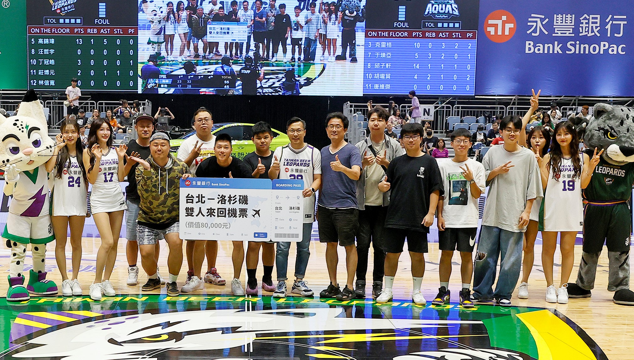 圖說:永豐銀行本週末(6日及7日)攜手「台啤永豐雲豹」職業籃球隊舉辦「Make Ai Wish」主題日,挑戰中場遊戲可贏得神秘聖誕大獎。圖為今(2025)年4月永豐銀行主題日中場遊戲獲獎者與貴賓、球迷合影。