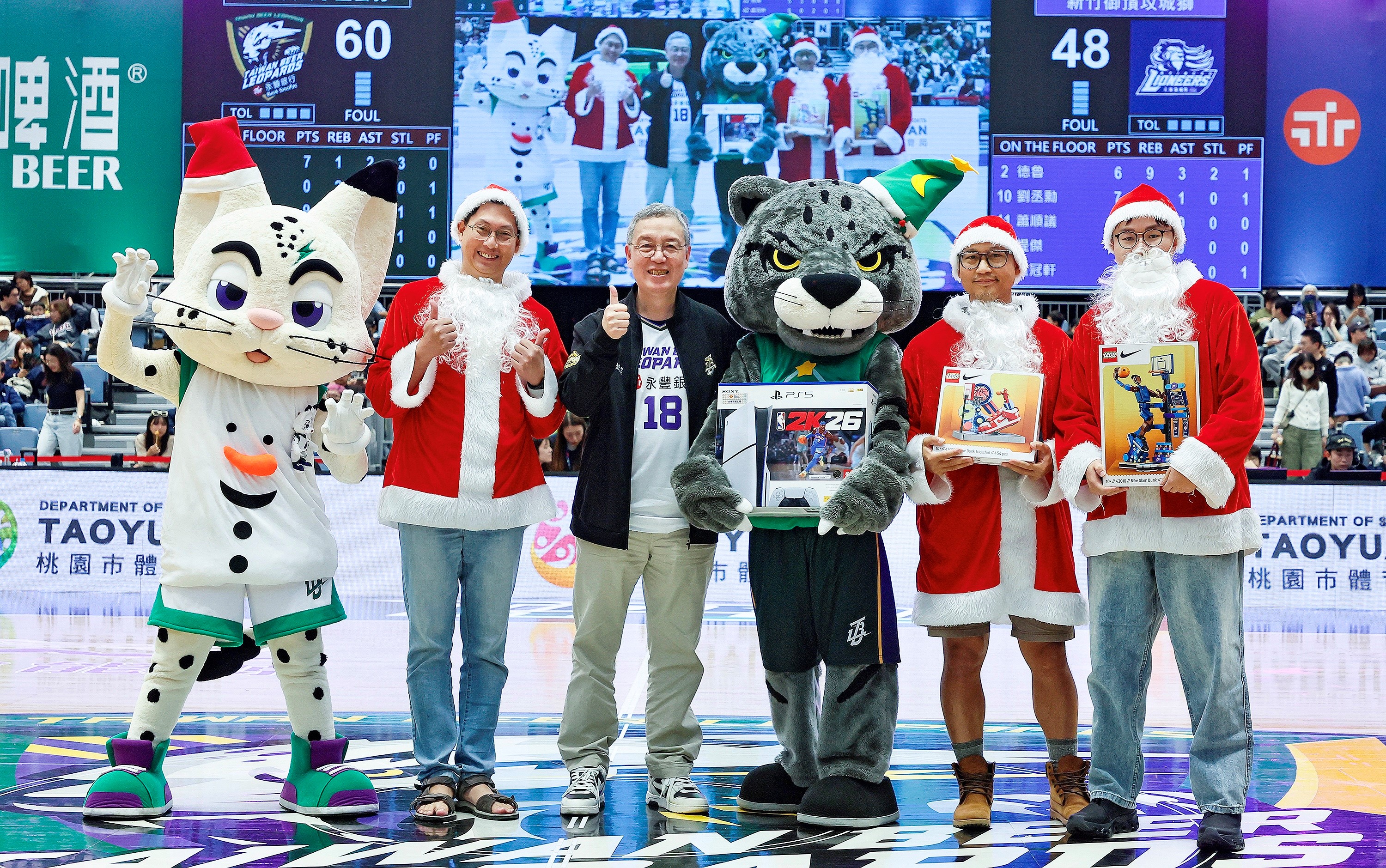 圖說:「Make Ai Wish」主題日中場時間邀請幸運球迷挑戰聖誕變裝上籃趣味競賽,由永豐銀行總經理莊銘福(左三)頒獎給參賽球迷,歡樂氣氛感染全場。