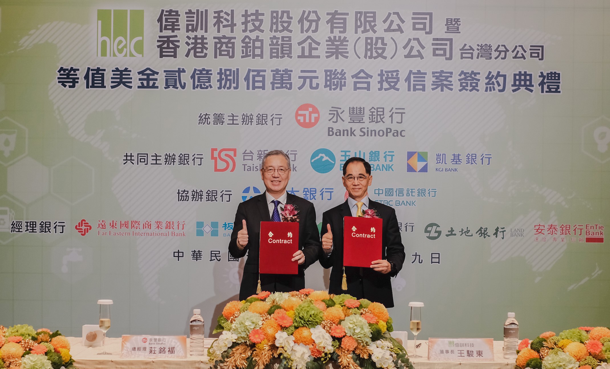 圖說:永豐銀行統籌主辦偉訓集團5年期等值美金2.08億元的新台幣聯貸案並擔任額度及擔保品管理行,今(29)日正式簽約。左為永豐銀行總經理莊銘福,右為偉訓科技董事長王駿東。