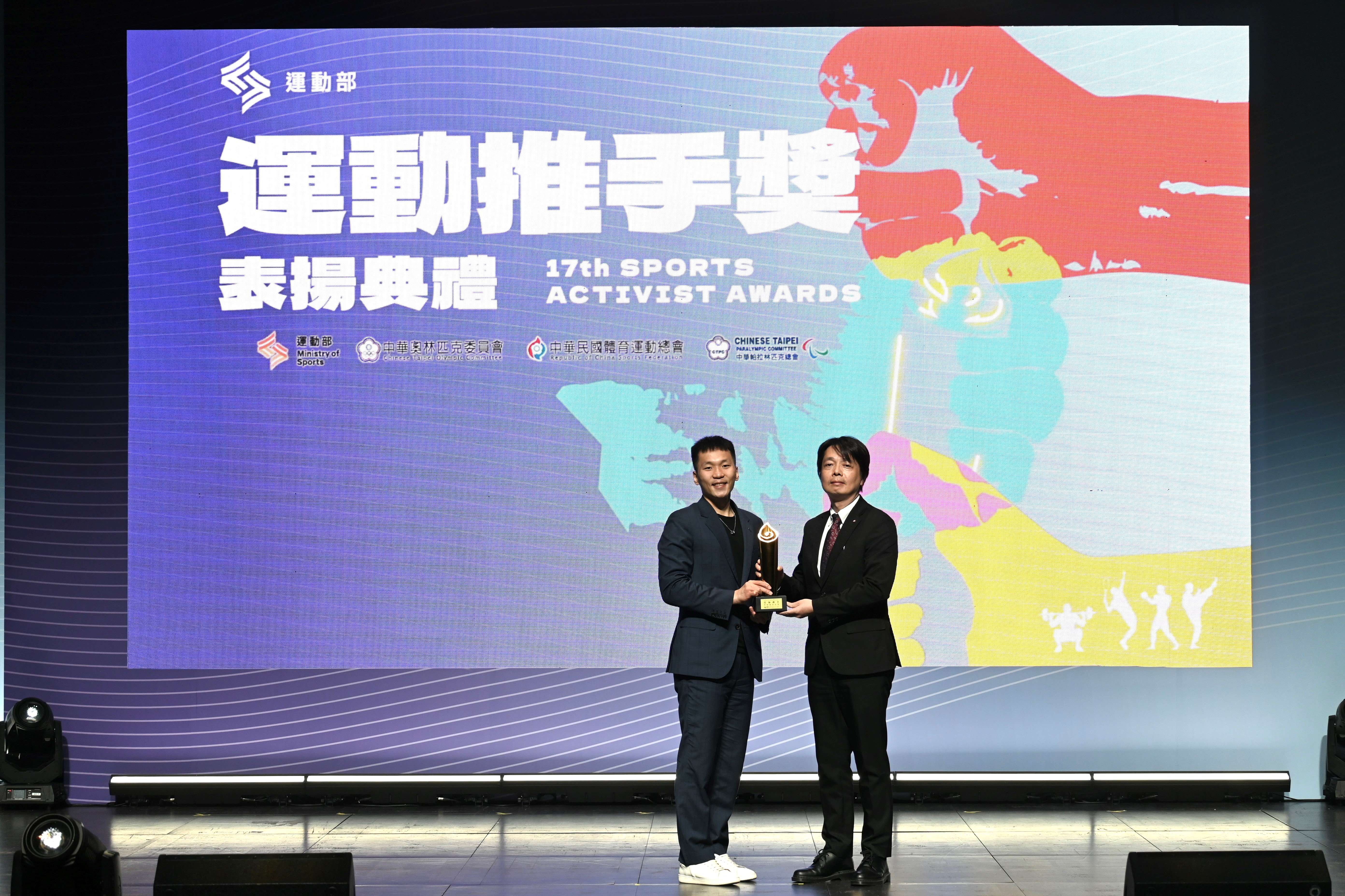 圖說:永豐銀行榮獲運動部頒發「運動推手獎-贊助類金質獎」,由運動部長李洋(左)頒發獎座予永豐銀行協理林宗勳(右)。