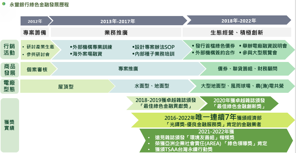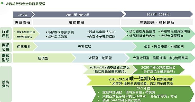 永豐銀行首創「過橋融資(Bridge Loan)」以減輕建置電廠的資金負擔、提升企業投資意願;另推出臺灣首檔綠色債券、串接綠能資金融通與建設需求;永豐銀行更首度結合民間交易、促成全臺首件綠電交易融資案,協助企業接軌RE100國際潮流。