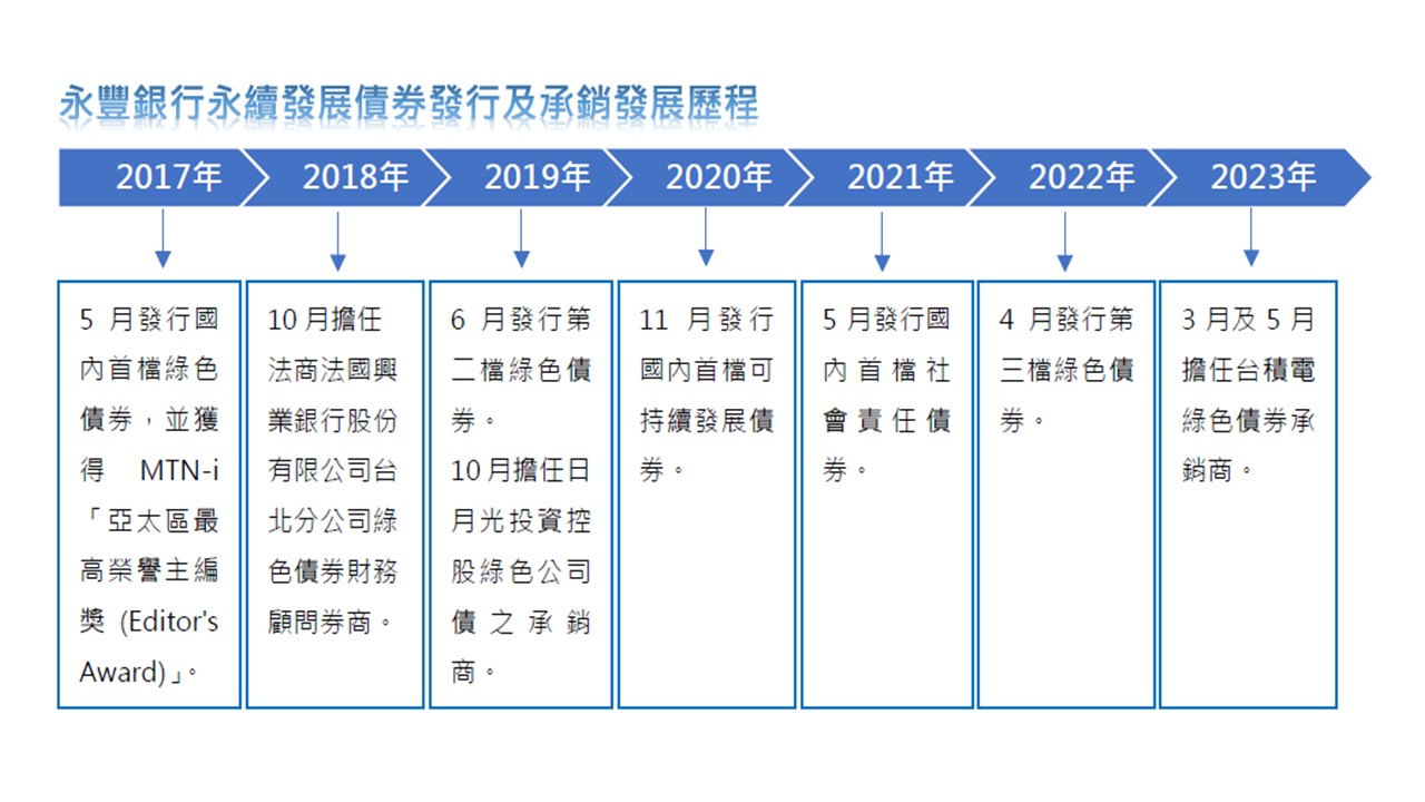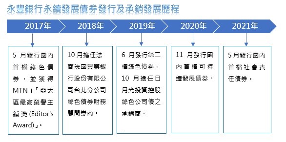 此外,永豐銀行並擔任法商法國興業銀行股份有限公司台北分公司綠色債券及日月光投資控股股份有限公司綠色公司債之財務顧問/承銷商,協助綠色債券的發行與銷售。