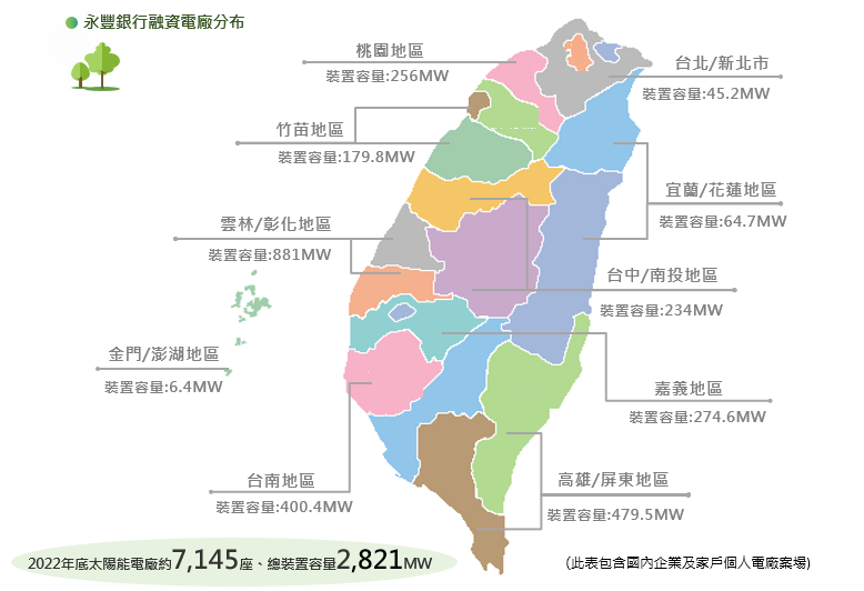 永豐銀行積極打造創能、節能、儲能、金融四合一的一站式綠電平台服務,力挺政府、產業齊力推動能源轉型、邁向永續家園。為持續協助綠色產業發展所需營運資金,永豐銀行積極啟動籌組大型太陽能電廠聯貸案,建置類型涵蓋屋頂型、地面型及水面型並持續擴大規模。亦與各縣市政府簽屬合作意向書、成為首家參與臺灣國際太陽光電展(PV Taiwan)的金融業,2024年底太陽光電國內企業電廠融資餘額逾新臺幣1,282億元。未來將持續打造與時俱進的創新金融服務,開拓再生能源的新市場、新客戶及新產品。