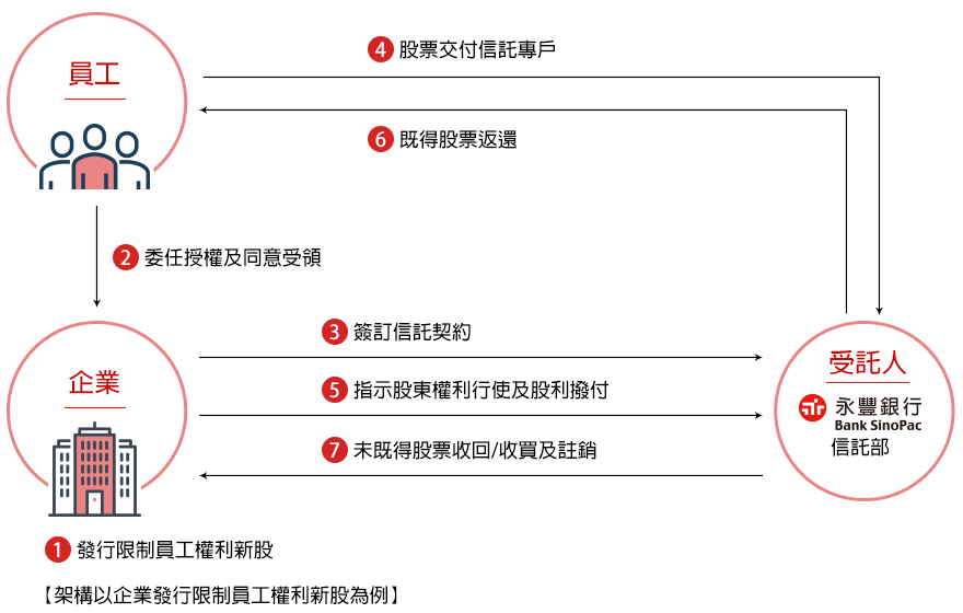 公司為留任優秀人才及激勵員工表現,可依企業不同發展階段選擇其適用的獎酬工具搭配信託機制,將所提撥公司獎勵金、員工提存金或配發公司股票(如限制員工權利新股、庫藏股票或現金增資股票)交付銀行(受託人)專業管理運用,並由銀行(受託人)依信託契約及員工獎酬辦法約定分期或一次返還信託財產給員工,藉以共創勞資雙方雙贏,進而增加員工退休生活保障。