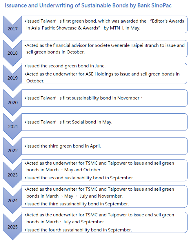 In order to respond to the government policy and to fulfill corporate social responsibility, Bank SinoPac issued a green bond worth US$45 million in May 2017. This green bond initiative was awarded the "Editor's Awards in Asia-Pacific Showcase & Awards" by MTN-i, an internationally renowned platform providing bond market coverage, in recognition of Bank SinoPac's leadership in Taiwan's green bond market. In 2019, Bank SinoPac issued another green bond worth NT$3 billion.