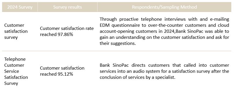 - Wealth management satisfaction survey: Each quarter, Bank SinoPac implements telephone surveys on customers who have purchased wealth management products in the previous quarter to understand the customers' investment attributes, satisfaction and recommendations on the investments, product suitability and service quality of the sales person in order to protect the rights of customers.