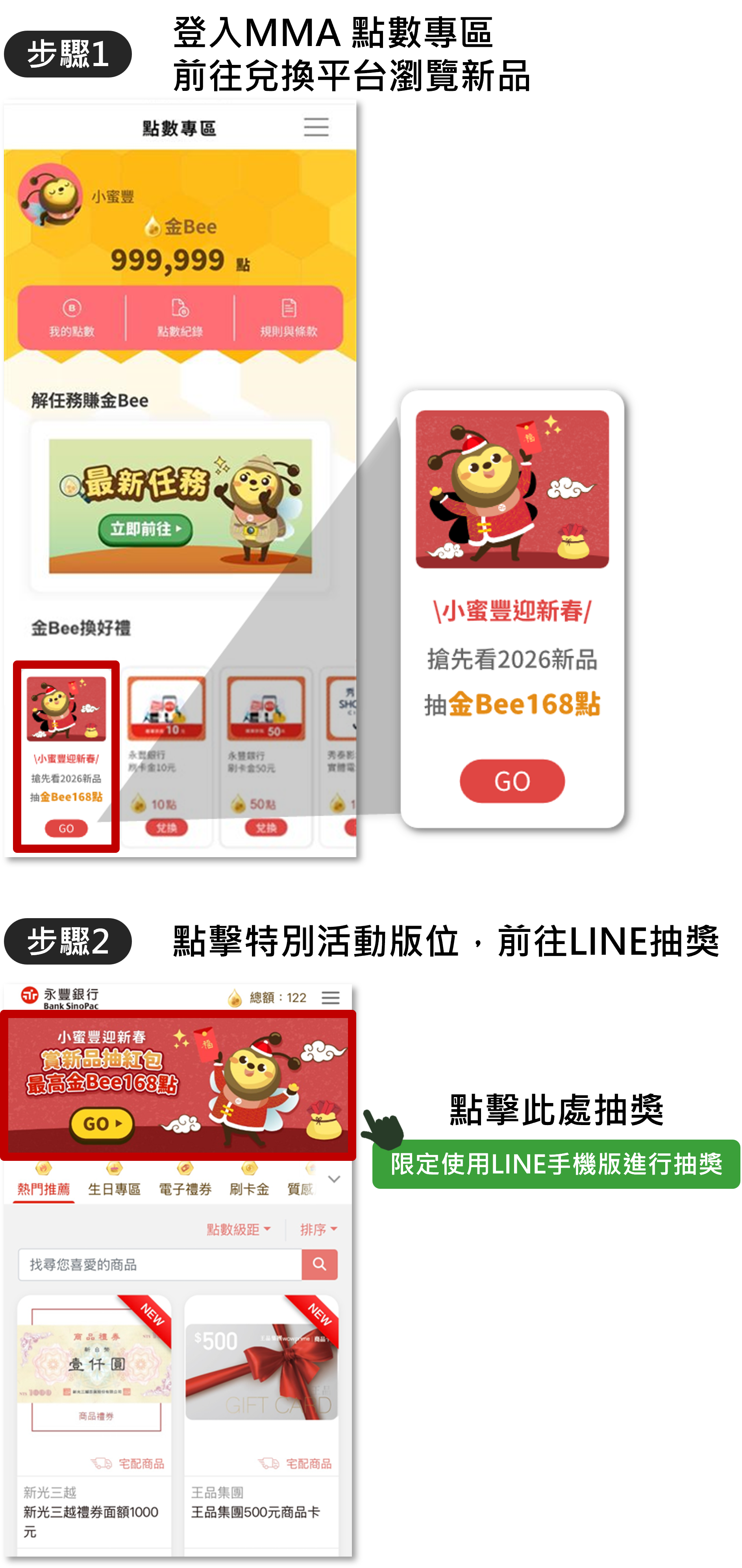- 本活動所獲得相對應之金Bee點數將直接入點,如欲查詢及兌換,可透過永豐銀行LINE官方帳號相關入口、MMA金融交易網、永豐行動銀行APP或DAWHO APP連結至【小蜜豐】點數專區查詢近一年點數累積與兌換紀錄,點數效期、使用限制等相關規範請詳閱「永豐小蜜豐點數計畫使用約定條款」。