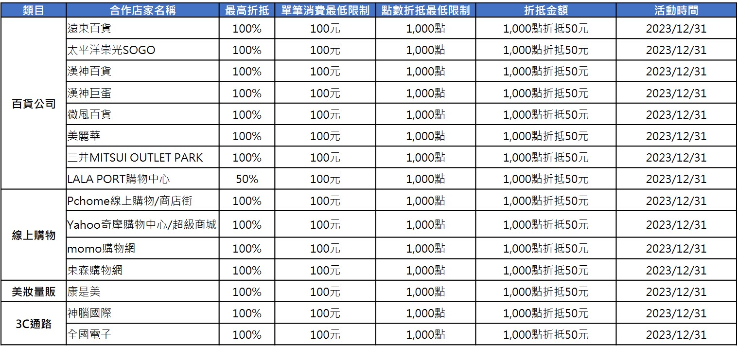 - 本活動紅利折抵的商品項目,如:超市、小吃、遞延性商品是否適用紅利折抵活動及各家廠商紅利折抵活動期間依各店家規定或公告為準。