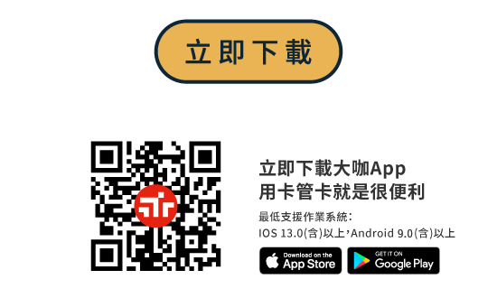 - 大咖App目前尚未提供Debit卡及JCB卡之Apple Pay快速綁卡服務,若需綁定Apple Pay,請您透過iPhone錢包App操作。