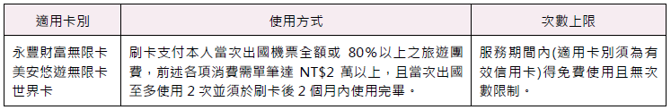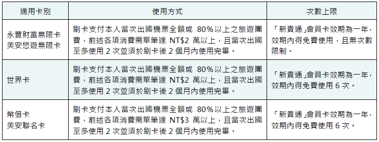 (例如︰客戶持有卡片一般消費,永豐財富無限卡10萬元、世界卡10萬元、幣倍卡5萬元、美安聯名卡5萬元,合計為30萬元) - 免費次數條件:正、附卡合併計算免費使用次數,倘違反使用規定、使用超出免費次數、未符合使用條件、攜帶同行貴賓使用,為自費使用,將於持卡人信用卡帳單收取每位每次NT$900費用。