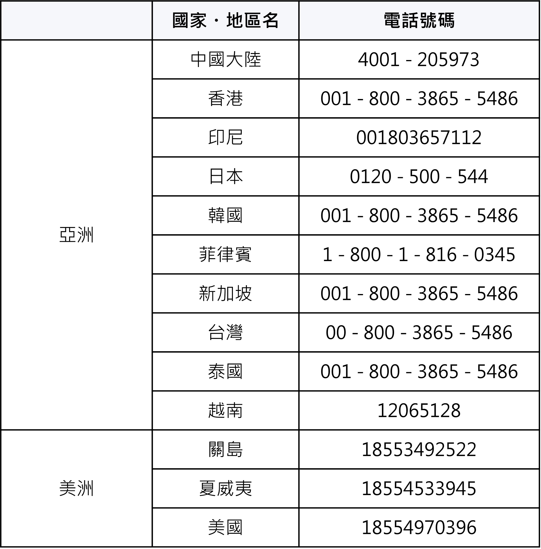 (1)若您位於台灣請撥打台灣區免付費電話:0080-110-3400(市話免費)