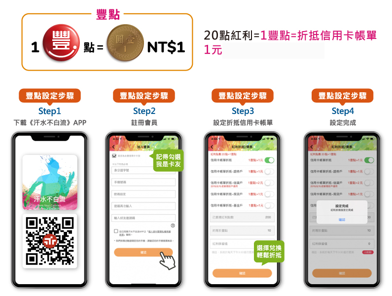 還覺得紅利不好用嗎?擔心紅利不知用在哪嗎?紅利變豐點,只要能刷卡,處處都是你的豐點店。下載汗水不白流APP,設定完成即可紅利直接折抵帳單。