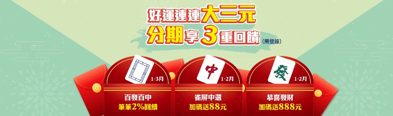 不限通路,刷永豐信用卡,單月分期消費滿3筆(限6期分期含以上)且每筆須滿3,000元並完成登錄,加碼再送100元刷卡金(每波活動回饋上限300元) ※每波名額總限量2,000名,第1個月開放登錄800名、第2個月及第3個月分別開放登錄600名,於每月24日(1/24、2/24、3/24、4/24、5/23、6/24、7/24、8/22、9/24、10/24、11/24、12/24)下午3:00開放登錄 |