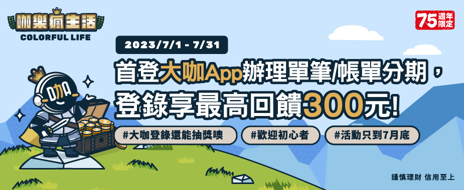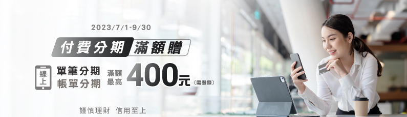 - 活動內容:符合分期新戶資格之客戶線上申辦單筆消費分期或帳單分期並登錄,每戶擇優回饋乙次,上限700元刷卡金(單筆滿額回饋400元+指定健身通路回饋300元)