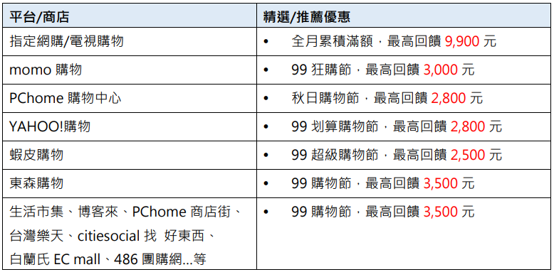 - 活動期間每卡戶限擇優回饋乙次,惟回饋對象為有效之正卡持卡人。贈送之刷卡金將於活動結束後次次月起陸續回饋。本活動贈送之「刷卡金」僅限折抵信用卡消費款,恕不得要求轉讓、提領或兌現。