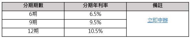 - 請於帳單結帳日前,自行登入網路會員或致電客服專線(02)2528-7776申辦,且單筆金額需滿1,000元,並需簽署「消費分期約定事項」始得享有分期優惠,若當月款項已結帳,則無法處理。