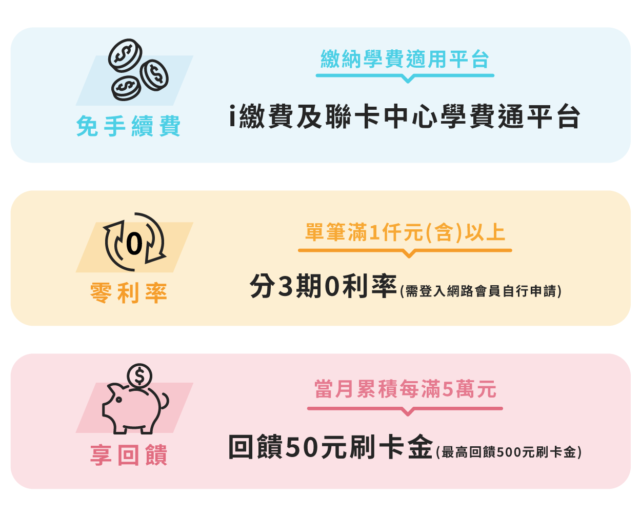 - 繳納學費當月累積滿額享刷卡金回饋,每戶正附卡合併計算,當月繳納學費每滿50,000元,享回饋50元刷卡金,每月回饋上限500元刷卡金,於代繳成功之次次月回饋,將回饋至有效正卡人之信用卡帳戶。