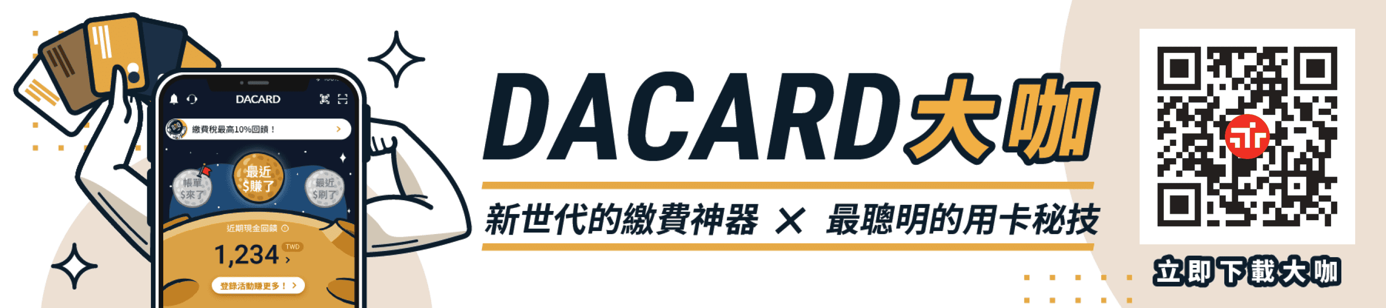 活動內容:活動期間內,首次於指定通路(限透過DACARD大咖APP、公共事業費用約定書或於信用卡申請書等)申請自動扣繳水、電、瓦斯、停車費或中華電信費,並完成登錄及任一項目成功扣款,即享50元刷卡金,每戶最高回饋250元刷卡金,限量登錄4萬名。