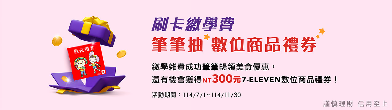 - 本活動不適用卡別 : Daway卡、公司卡、配銷卡、八通卡、儲值卡、簽帳金融卡不適用。