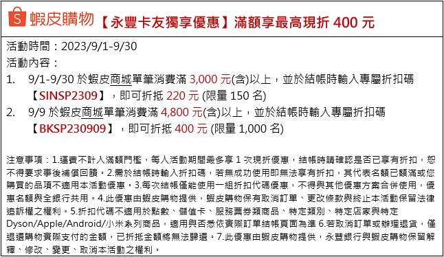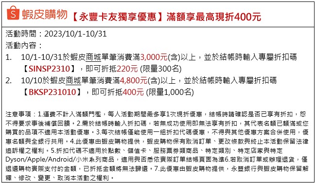 蝦皮購物刷永豐,消費滿額享優惠,讓您購好購滿!