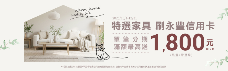 四、活動內容:於上述特選家具通路刷永豐信用卡,單筆分期滿額並完成登錄,享刷卡金回饋。