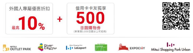 活動期間內持永豐信用卡於下方列示指定品牌(MITSUI OUTLET PARKDriver City TokyoLaLaport…等)內之外國客人綜合服務台,出示永豐卡及QR CODE圖碼即享以下優惠: