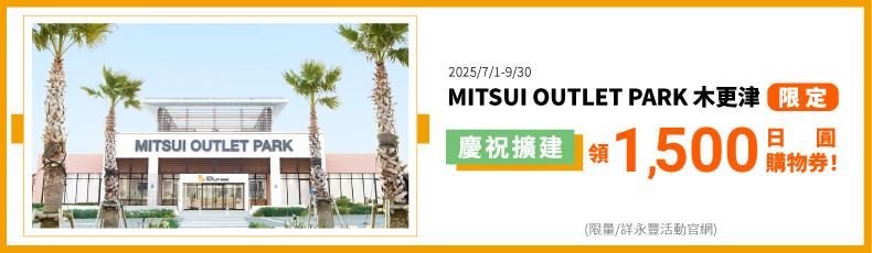 6. 日本優惠內容及折扣所適用之期間與條件,依日本各MITSUI OUTLET PARK& Mitsui Shopping Park現場公告為準。不可併用其他優惠活動,詳情請詢問各店鋪人員。