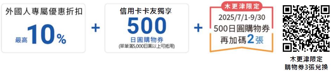 ※外國人專屬優惠折扣依券上使用說明為主;500日圓購物券需消費滿5,000日圓方可使用乙張;相關使用方式與期限及其餘未盡之事宜請詳現場及券上說明。