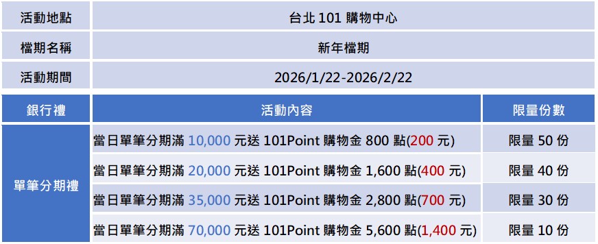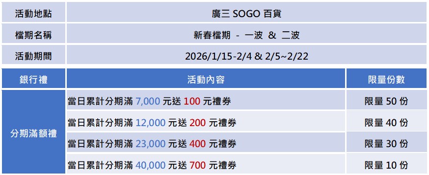 檔期活動期間,於下列特選百貨當日單店單卡刷永豐信用卡分期滿額,送購物金點數乙份: