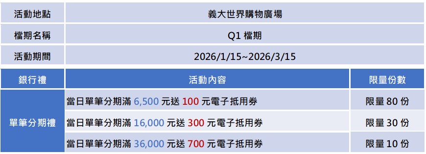 檔期活動期間,於下列特選百貨當日單店單卡刷永豐信用卡分期滿額,送電子禮券/抵用券乙份: