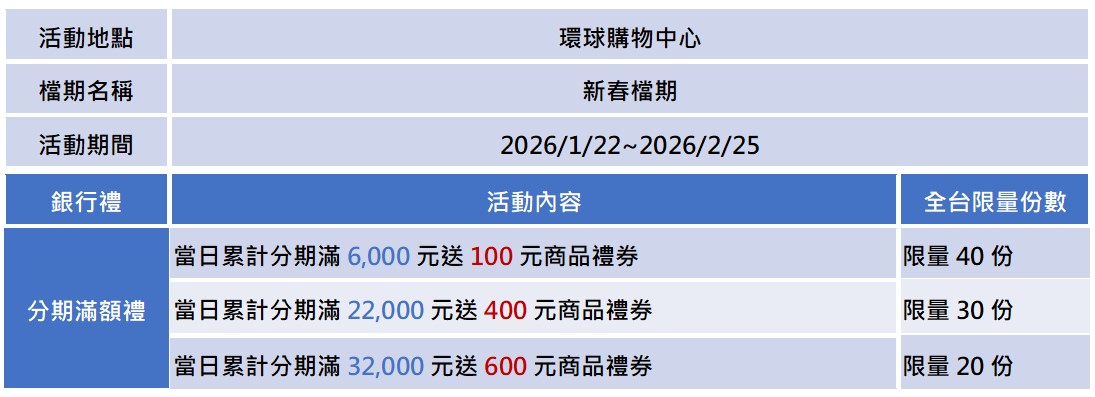 - 本活動之贈品若為電子禮券,消費結帳請提供會員手機號碼或出示會員行動條碼,消費達門檻後,電子酬賓券即時歸戶。銀行禮為多門檻活動,系統採自動增額回饋;若該門檻份數已兌畢,系統則不會再進行發送,兌畢將公告於各百貨官網及APP最新消息。