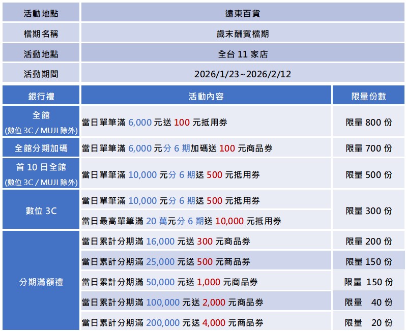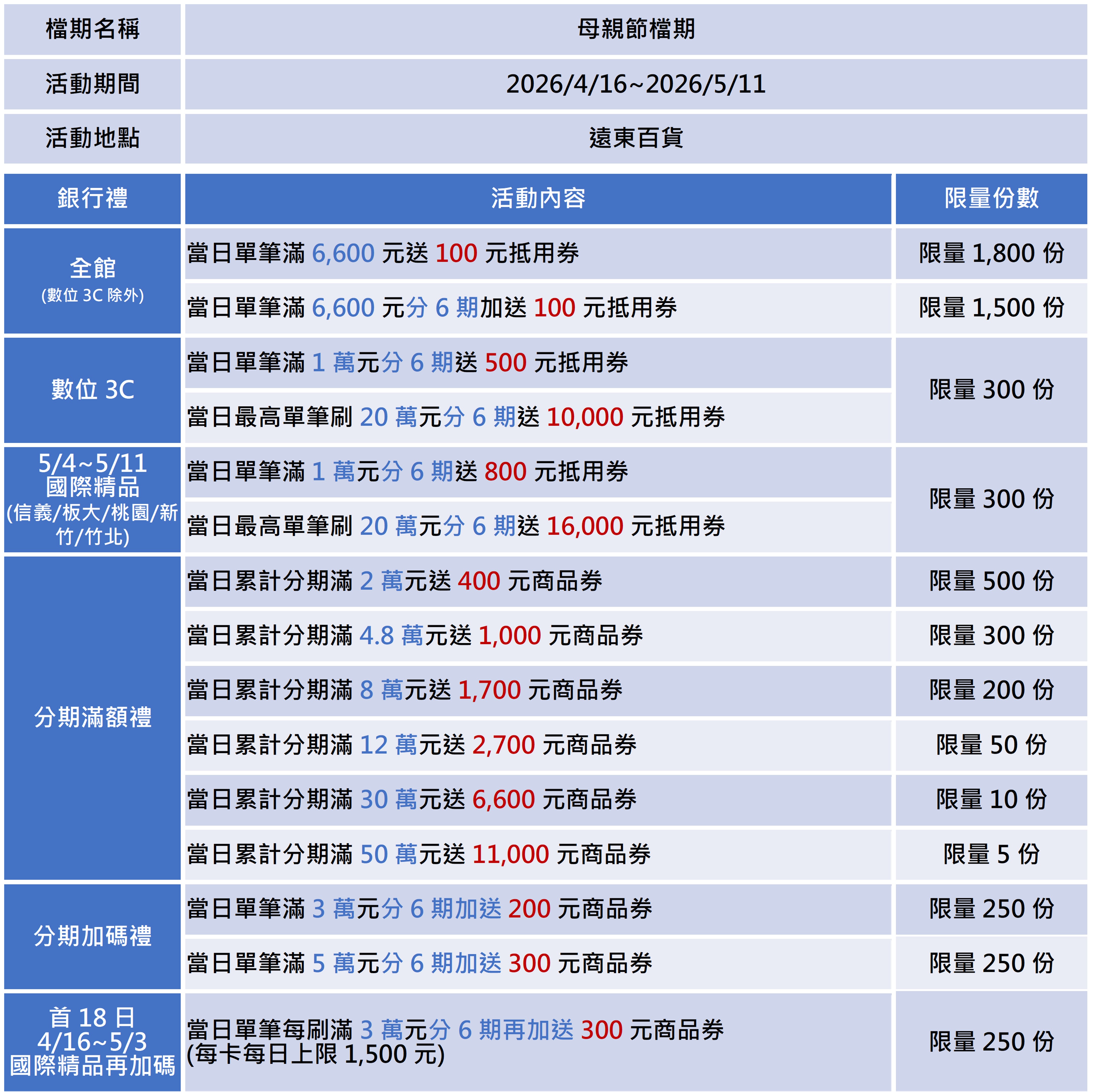 檔期活動期間,於遠東百貨當日單店單卡刷永豐信用卡,滿額送遠百抵用券或商品券乙份: