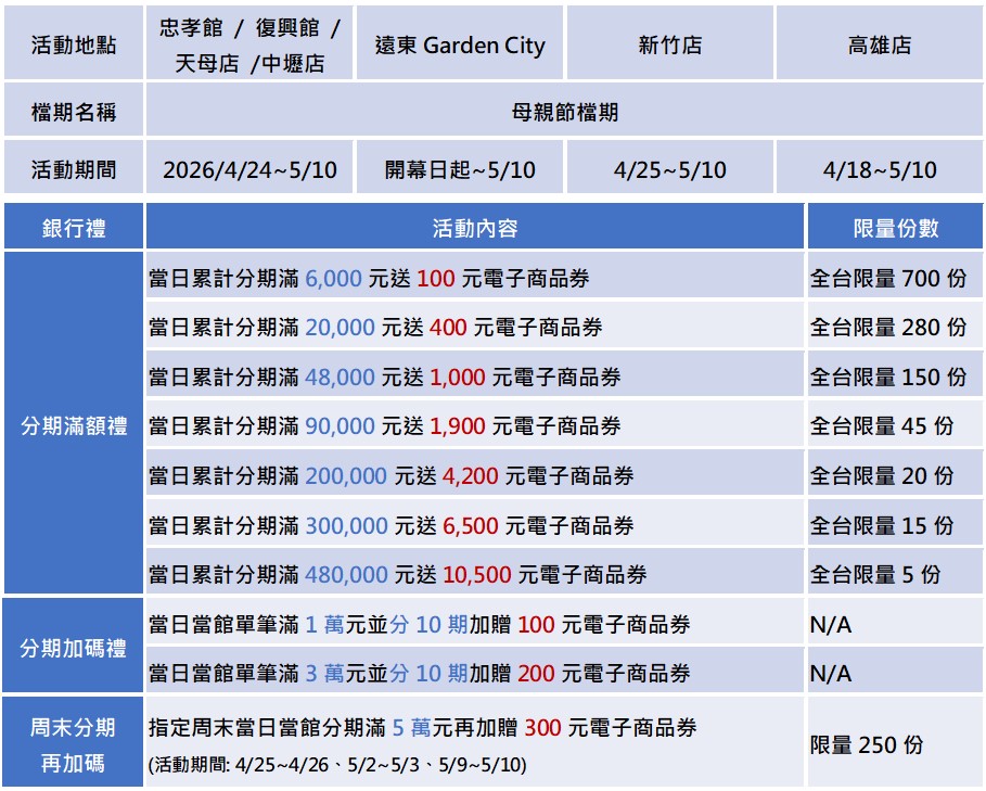 檔期活動期間,於下列特選百貨當日單店單卡刷永豐信用卡分期滿額,送贈品/電子禮券/抵用券乙份: