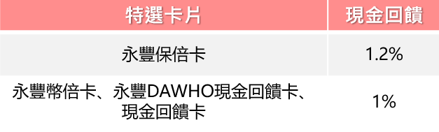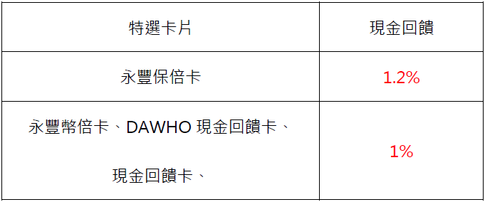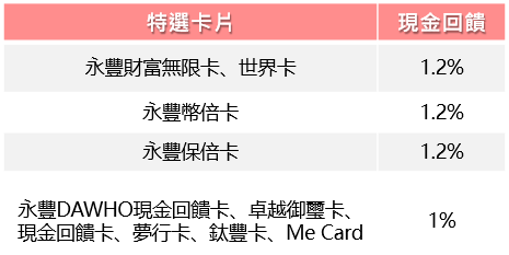 四、活動內容:以永豐特選卡片代繳適用壽險公司之保費且成功扣款者,回饋率如下表