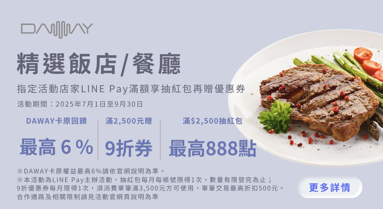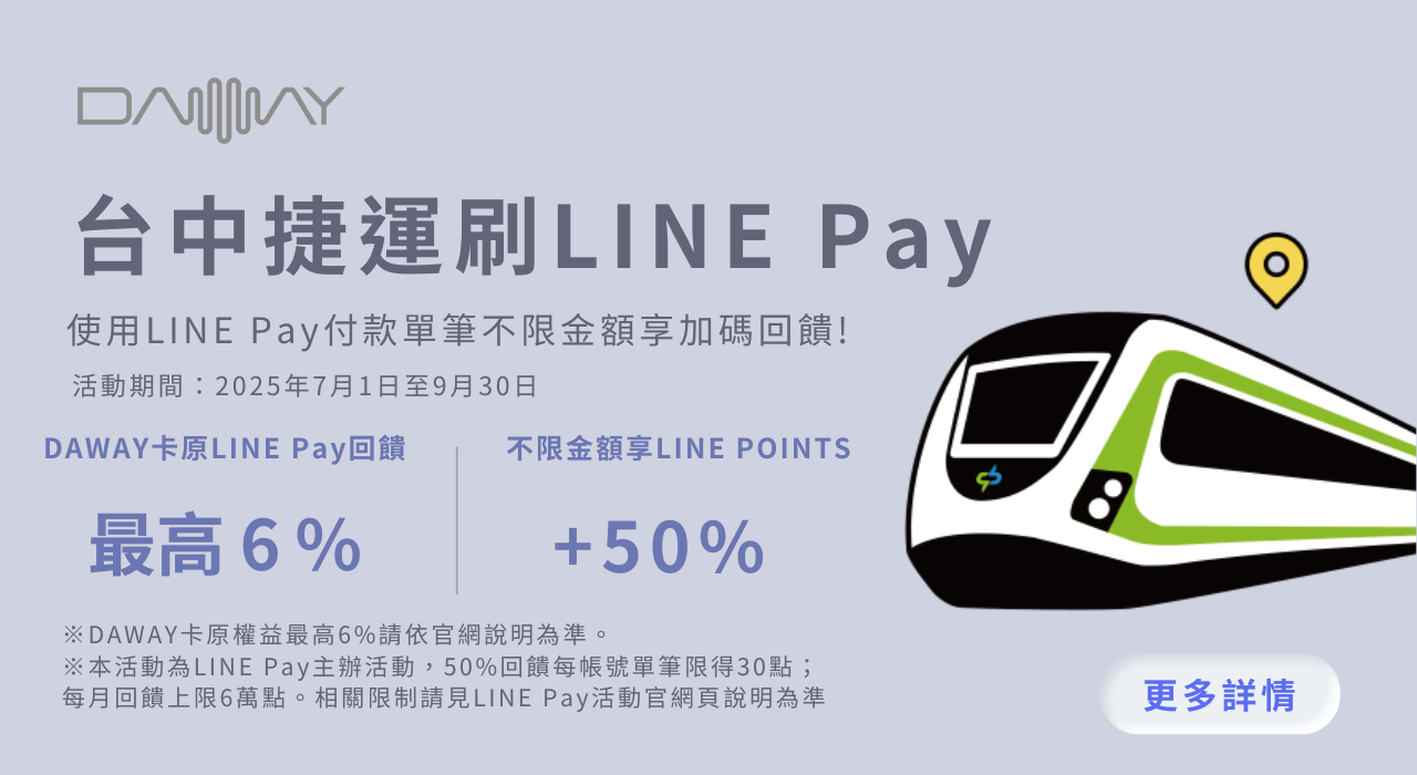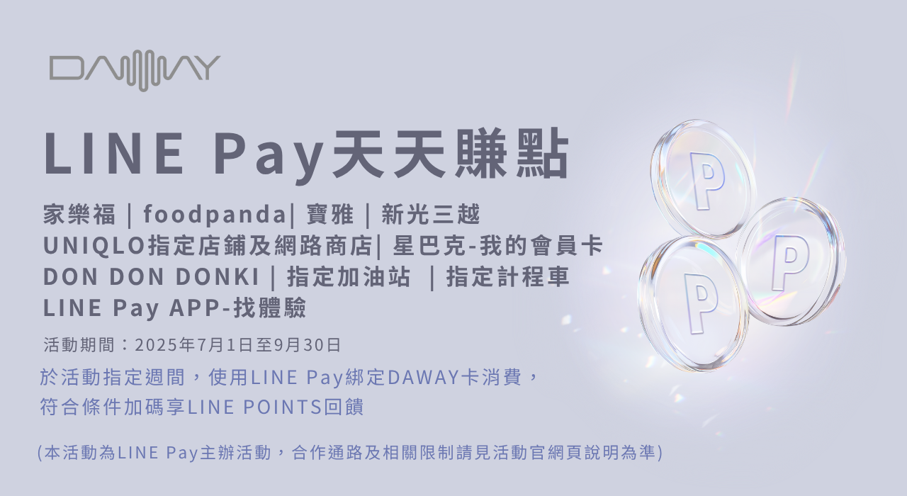 - LINE Pay交易定義:國內一般消費使用DAWAY卡綁定LINE Pay交易,消費請款名稱須出現L*、連加、LINE PAY、LINE PA或可於LINE Pay消費紀錄中查詢之交易。