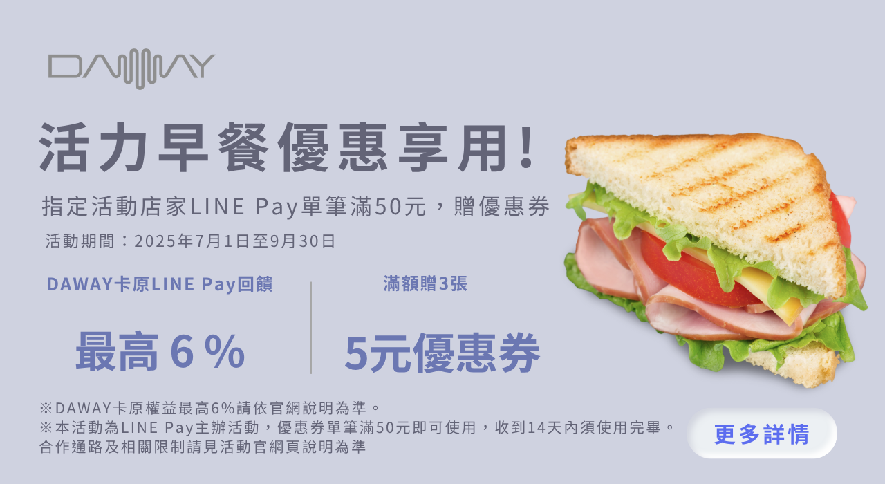 - 早餐咖啡:好康地圖領取10元優惠券,用LINE Pay付款單筆消費滿120元即可折抵